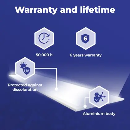 Questo pannello LED ha un ciclo di vita di 50000 ore, che vuol dire che funzionerà in modo ottimale per diversi anni. Questo ti permetterà di risparmiare sui costi di manutenzione e sostituzione! Inoltre, questo pannello LED è protetto da una garanzia di 6 anni. Infine, l'illuminazione LED permette di ridurre le emissioni di CO2 e, non contenendo sostanze tossiche, i LED possono essere riciclati.