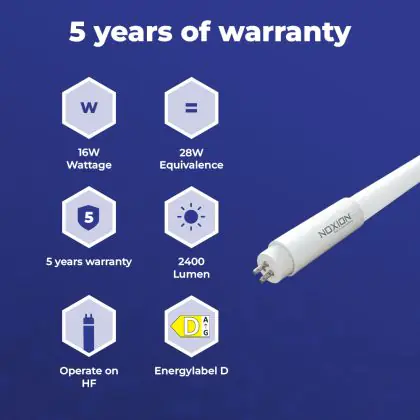 Il Noxion Tubo LED T5 Avant Extreme (HF) High Efficiency 16W 2400lm - 840 Bianco Freddo | 115cm - Sostitutiva 28W è un tubo LED perfetto per sostituire gli standard tubi fluorescenti di 28 W. Con questo tubo LED di Noxion ti assicuri una lunga durata e 5 anni di garanzia.