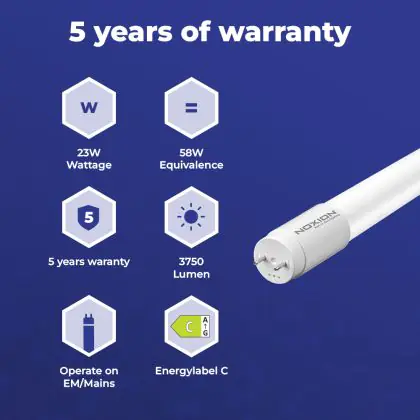 Il Noxion Tubo LED T8 (EM/Mains) Ultra Output 23W 3750lm - 840 Bianco Freddo | 150cm - Sostitutiva 58W è l’alternativa perfetta per il tubo fluorescente standard 58W nelle plafoniere con un reattore. Con questo tubo LED hai una garanzia di una vita media utile molto lunga e 5 anni Lampadadiretta.it di totale garanzia. .
