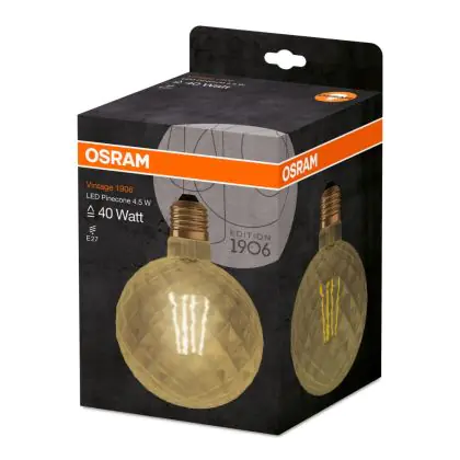 La Osram Vintage 1906 LED E27 Pine Filamento Oro 4.5W 470lm - 825 Bianco Molto Caldo | Sostitutiva 40W è la perfetta sostituzione per la tua lampada convenzionale 40W con attacco E27 grazie alla sua tecnologia LED. Passare a LED ti offrirà tanti vantaggi!